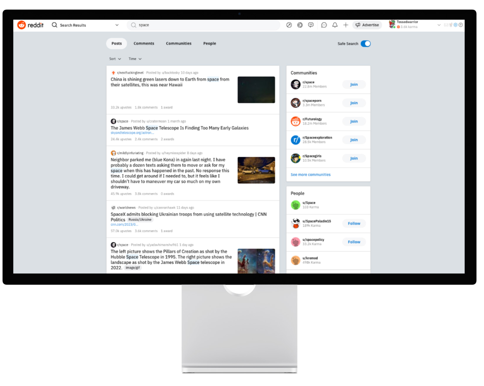 To make it easier for users to find and scan information on the web, I designed a two column layout. Our data showed that the majority of users are looking for posts first and communities second. My new design prioritized that.