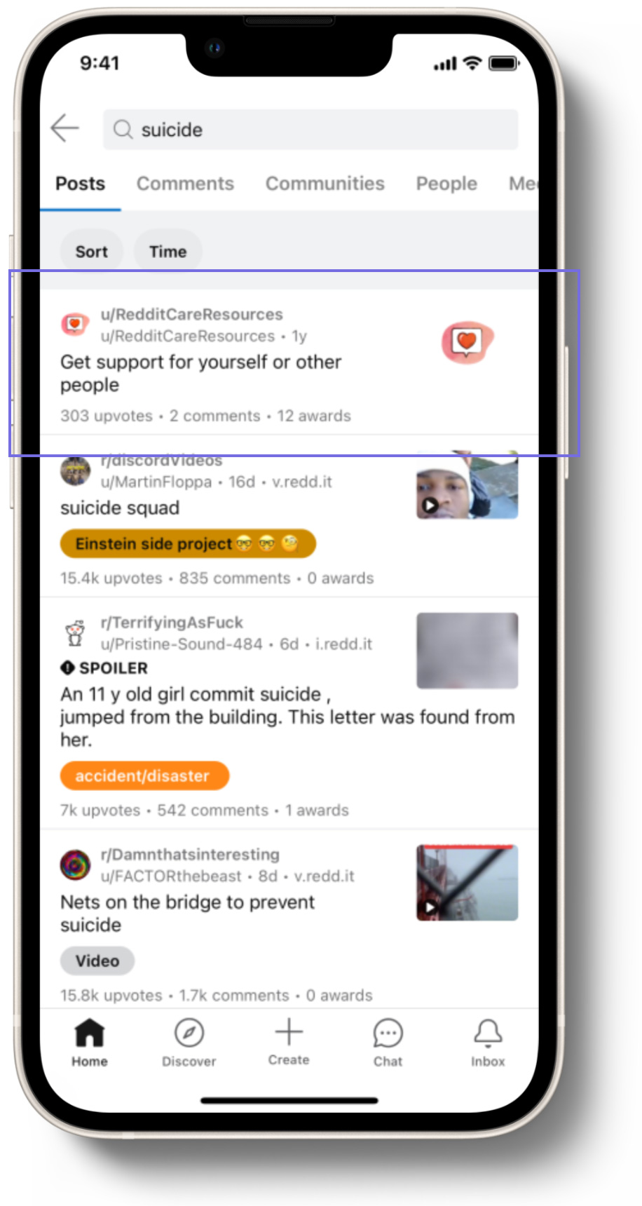Reddit has partnered with Crisis Text Line since 2019 to provide redditors with 24/7 support from trained Crisis Counselors. Previously, redditors could only find these resources if a concerned redditor reported something that worried them. Now, those using Reddit search to look for things that signal they may be seeking support for themselves or others will see relevant Reddit communities where they can get support, as well as information about Crisis Text Line and other off-platform support resources.